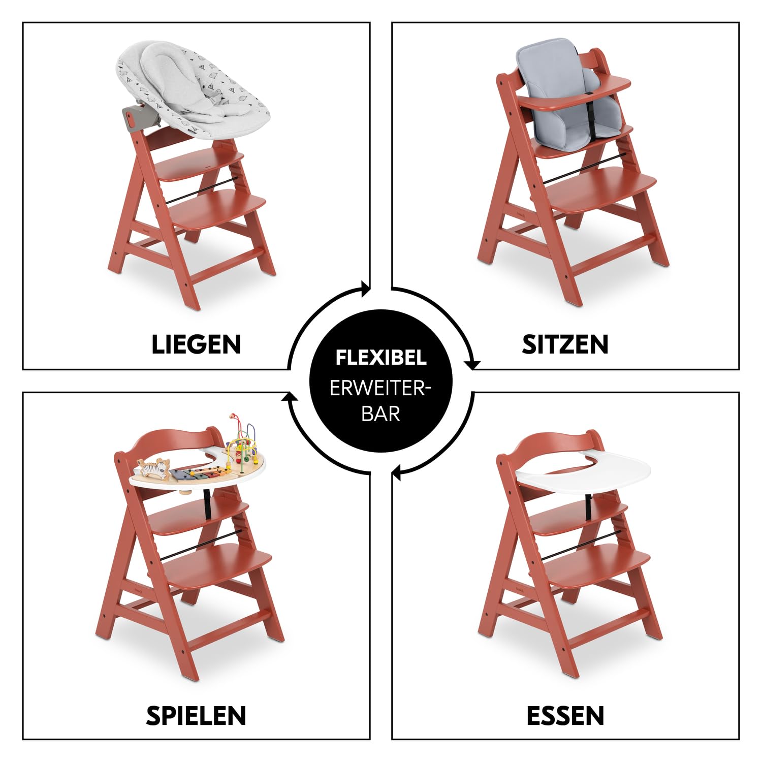 Die natürliche Holzoptik in der Farbe Cork fügt sich dezent in verschiedene Wohn- und Essbereiche ein. Der Hochstuhl ist mit einer Vielzahl von separat erhältlichem Zubehör kompatibel und kann flexibel erweitert werden.