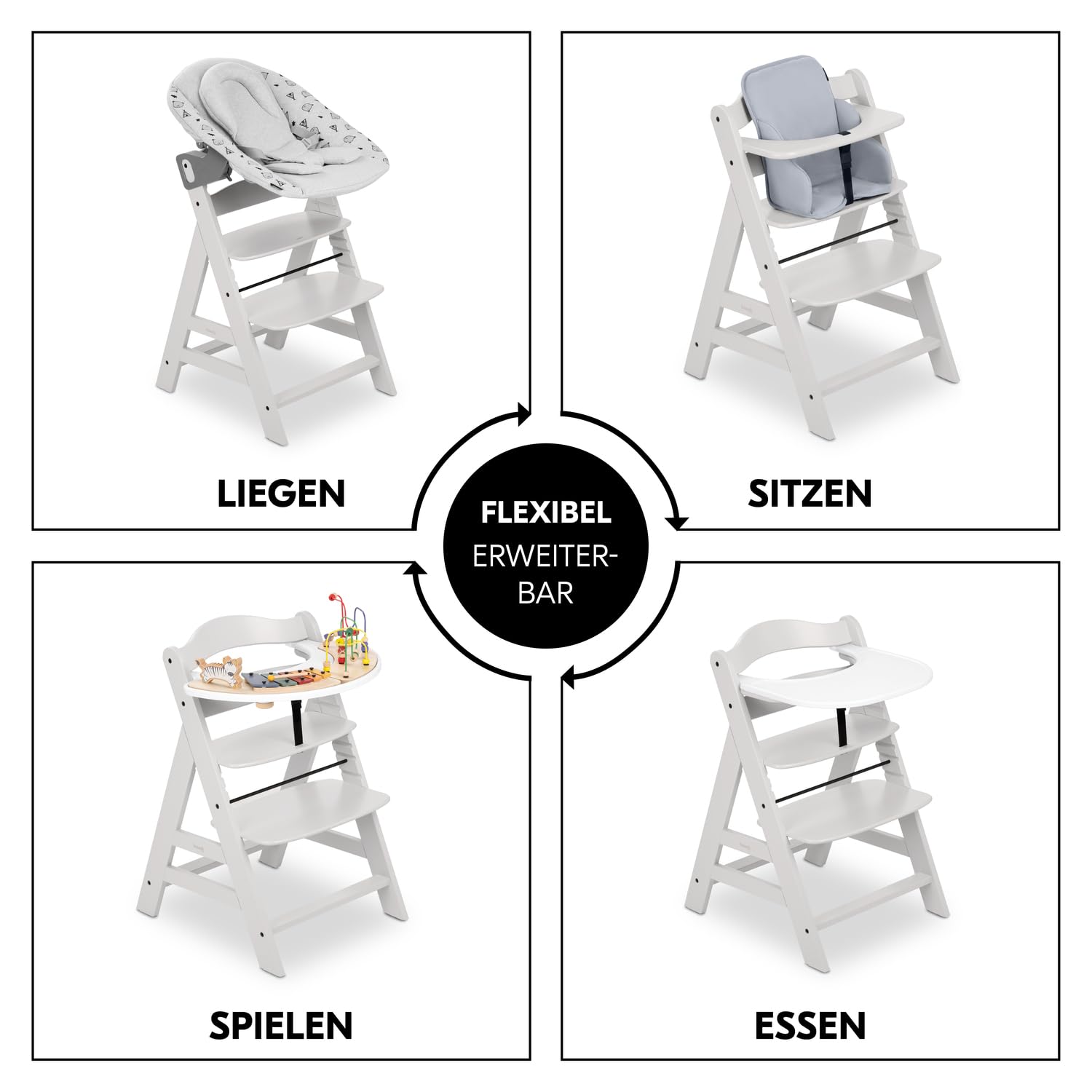 Die dezente Farbgestaltung in Creme fügt sich harmonisch in verschiedene Wohn- und Essbereiche ein. Der Hochstuhl ist mit einer Vielzahl von separat erhältlichem Zubehör kompatibel und kann flexibel erweitert werden.